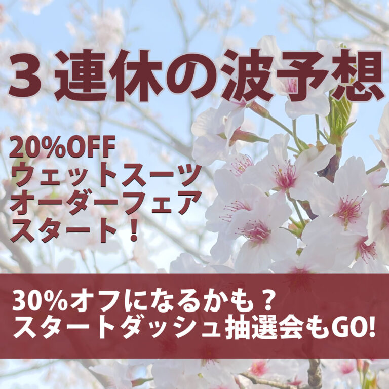 桜が咲きそうな3連休🌸店前サーフィンもできそう🏄♀️ ウェットスーツオーダーフェアは早めがお得!抽選会は初日から!大当たりは30%オフにランクアップ!ぜひ、当てに来てください […]