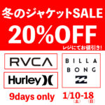 RVCA, Hurley, BILLABONG冬のジャケットSALE20%OFF 9日間限り!1/10(土)-18(日) レジにて、通常価格より20%値引きいたします。 真冬こそ、必要な極暖ジャケットが20%オフに!なにかと出費の多かった年末年始これ […]