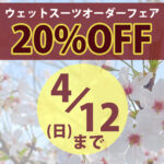 年度末ですね!お忙しいですか?新社会人?新生活?ウェットスーツオーダーフェアのチェックもお忘れなく! 4/12(日)でウェットスーツ20%OFFオーダーフェア、終わります! 夏のスプリングやシーガルもフェア対象です。 その気持ち、わかります!でも、値 […]