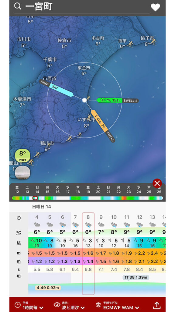 風:午前中は北西風のサイドオフショアですが、次第に北寄りの風に変わる予報