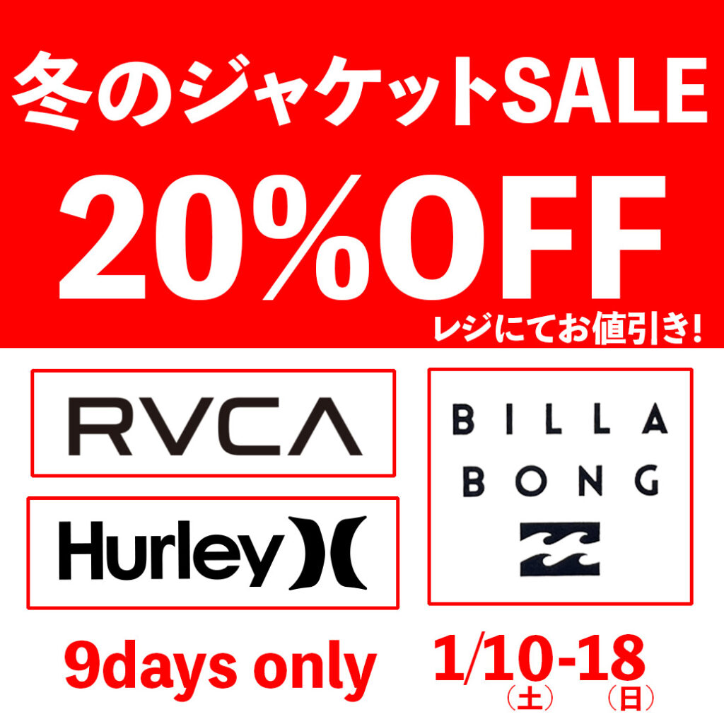 RVCA, Hurley, BILLABONG冬のジャケットSALE20%OFF