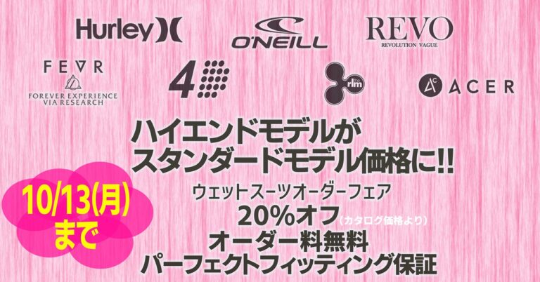 カタログ価格20%オフ+10%のオーダー料無料パーフェクト・フィッティングを保証 ウェットスーツ・オーダーフェア期間限定 9/20(土)~10/13(月) もしあなたが、 「今年こそセミドライの買換えが必要、、、」 「温かくて柔らかいハイエンド・セミ […]